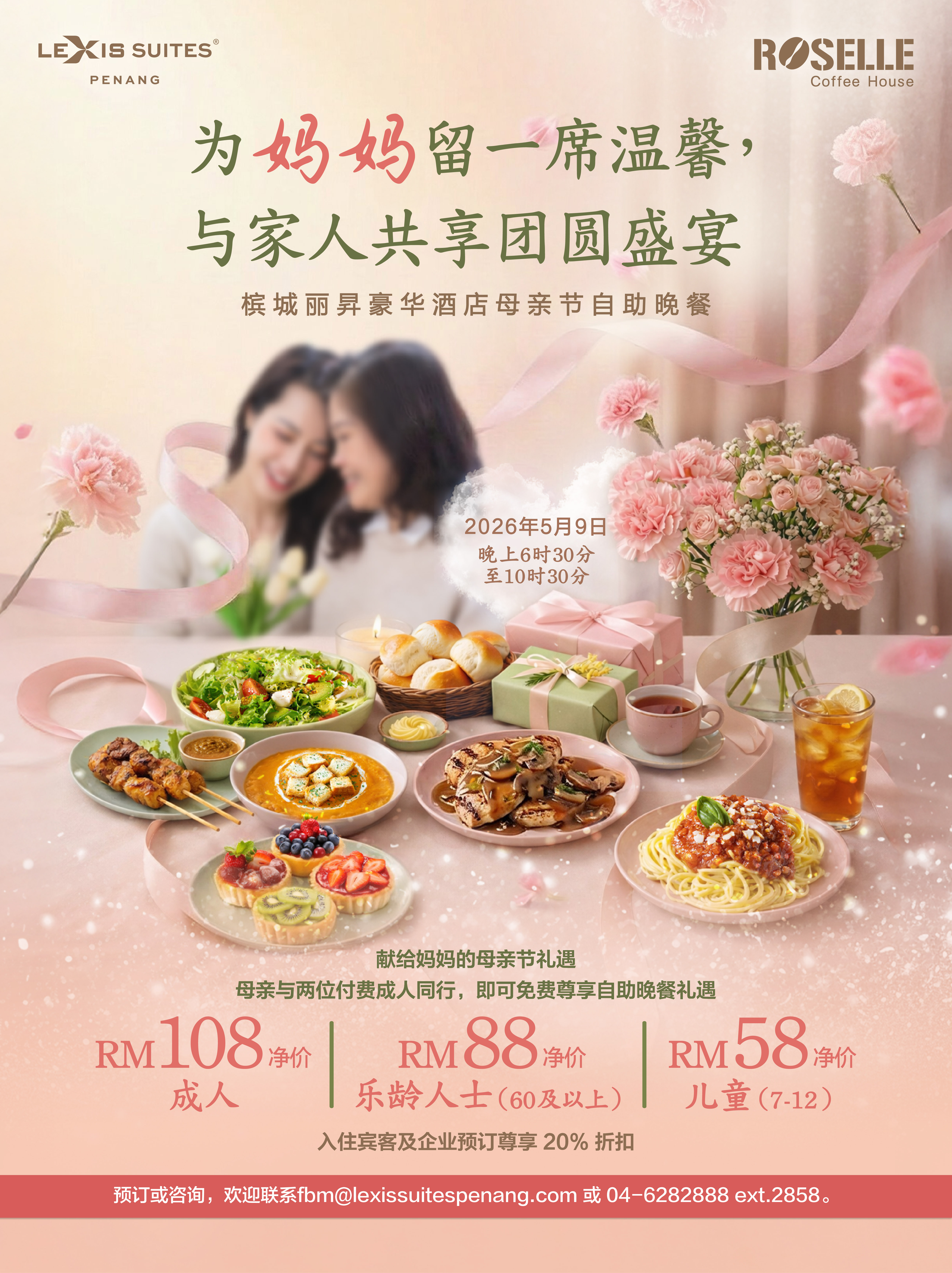 于 2026年5月9日,傍晚6时30分至晚上10时30分,前来 槟城丽昇豪华酒店的大红花餐厅,与挚爱的家人共庆温馨母亲节。精心呈献的母亲节自助晚餐汇聚缤纷美馔,为一家大小带来愉悦味蕾享受;母亲在两位付费成人的陪同下,更可尊享免费自助晚餐礼遇。优惠价格为每位成人净价 RM108、乐龄人士净价 RM88,以及儿童净价RM58;入住宾客与企业预订还可享有 20%折扣。
